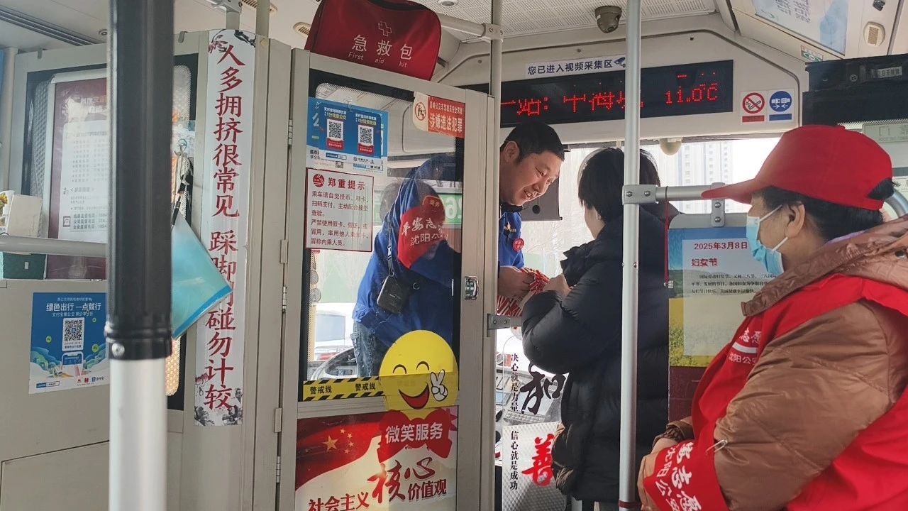 3月8日一大早,繆立眾駕駛滿載溫馨祝福的公交車準(zhǔn)時上線運營。在始發(fā)站,他用標(biāo)志性的問候語和站立式服務(wù)迎來了當(dāng)天的第一位女乘客??娏⒈妼⒕臏?zhǔn)備的小禮物遞給了這位女乘客,并微笑著送上節(jié)日祝福:“歡迎乘坐260路公交車,祝您節(jié)日快樂!”