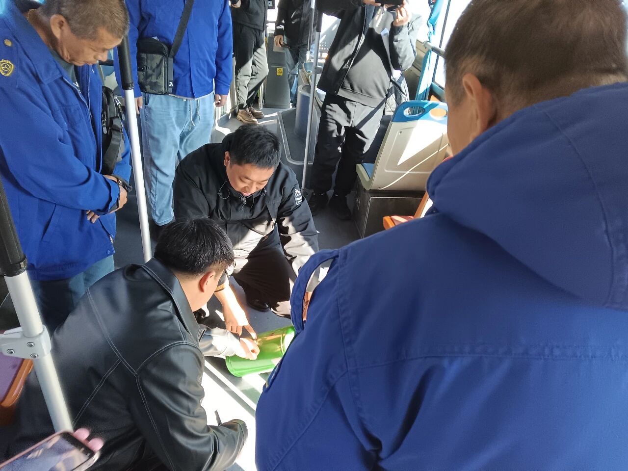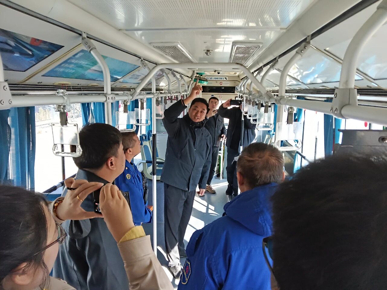 在現(xiàn)場(chǎng)演練環(huán)節(jié),王殿陽(yáng)主任為車隊(duì)管理人員和駕駛員模擬演示了公交車輛突發(fā)火災(zāi)時(shí)的應(yīng)急處理流程,包括駕駛員如何迅速疏散乘客至安全區(qū)域,以及如何正確使用滅火器撲滅火源,最大限度保障人民生命和財(cái)產(chǎn)安全。