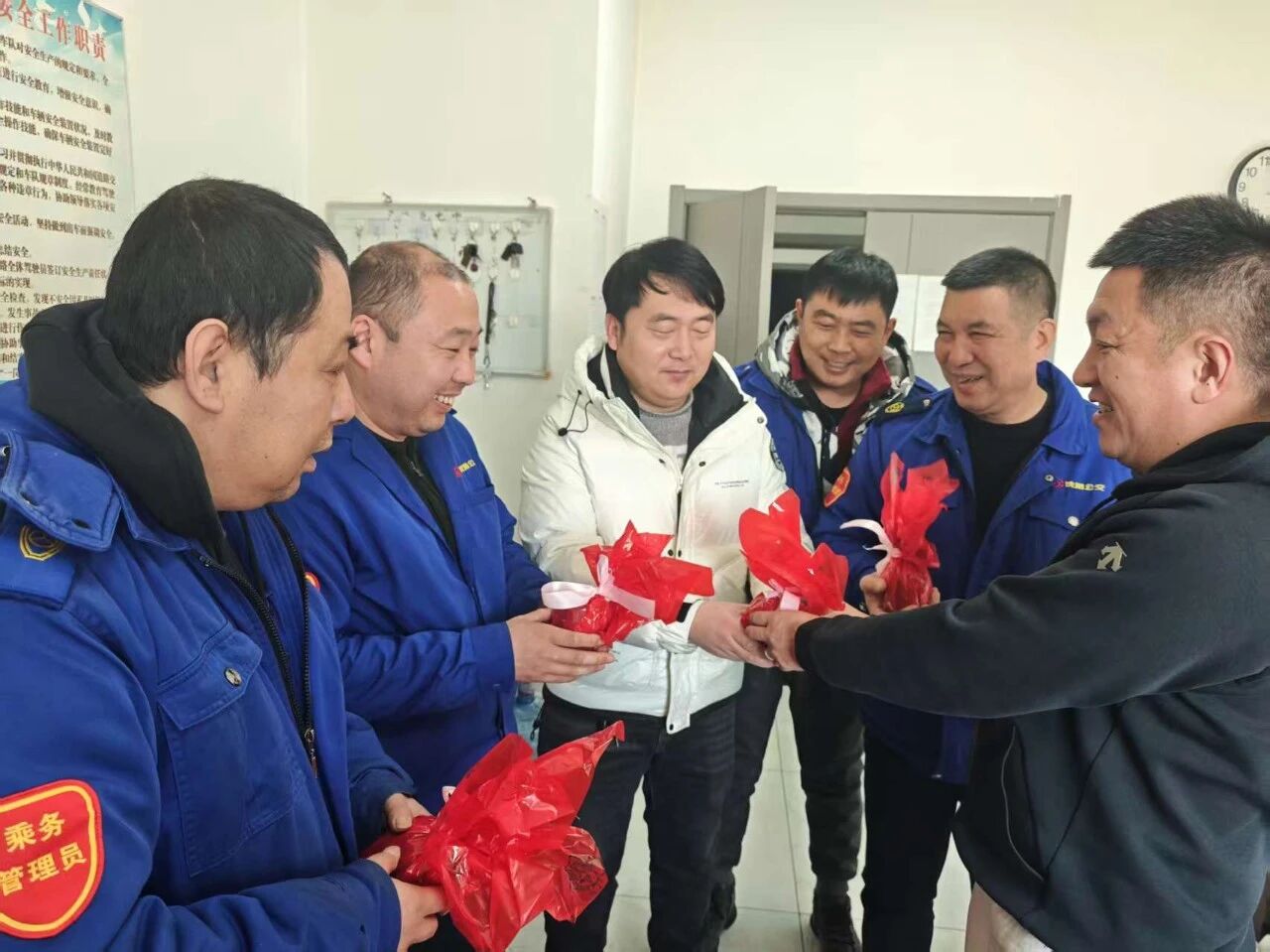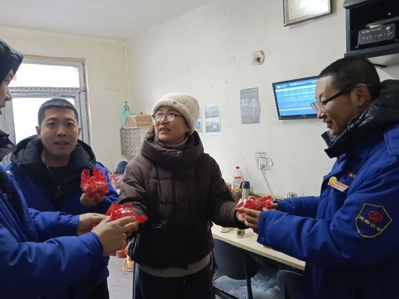 寒冷冬日,128路車隊(duì)休息室內(nèi)暖意融融。一份份精心包裝的“平安果”,被送到結(jié)束運(yùn)營返場的駕駛員手中,伴隨著一句句樸實(shí)而鄭重的安全叮嚀。