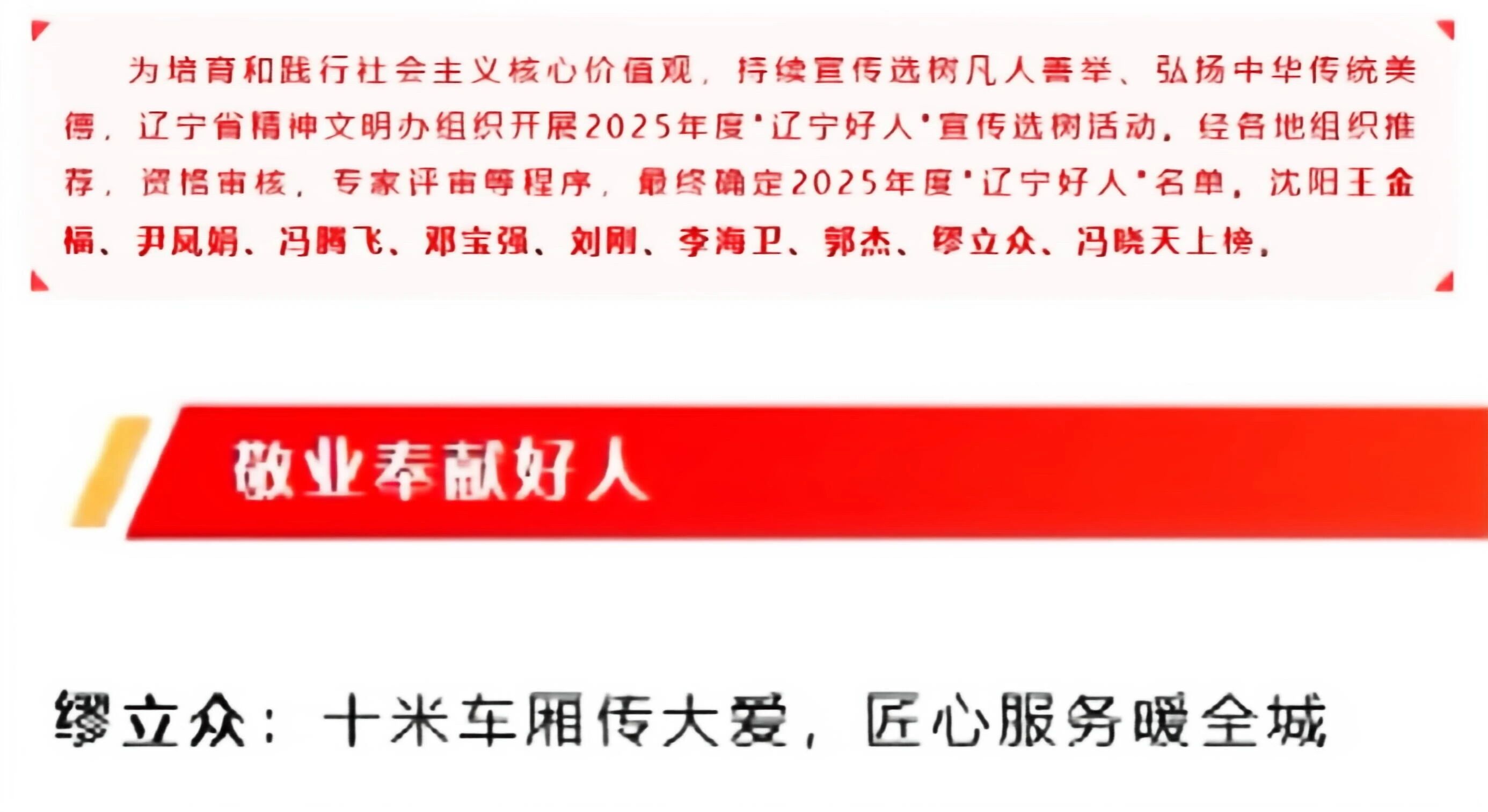 近日,遼寧省精神文明建設(shè)指導(dǎo)委員會揭曉2025年度“遼寧好人”評選結(jié)果,沈陽客運集團黃河公司260路駕駛員繆立眾榮獲“敬業(yè)奉獻好人”稱號。