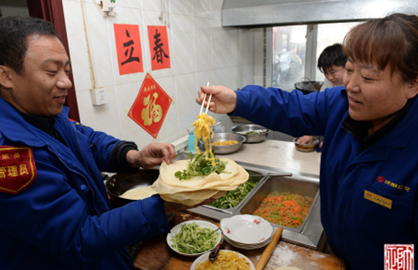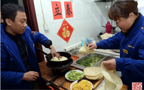 “哎呦,今天烙春餅啦!難怪老遠兒就聞見了香味兒???,給我先來兩張!”2月3日大年初七,是節(jié)后的第一個工作日,恰逢立春。11時左右,211路駕駛員張智剛跑完一圈兒回到大北門終點站,就被食堂的飯香吸引過去。