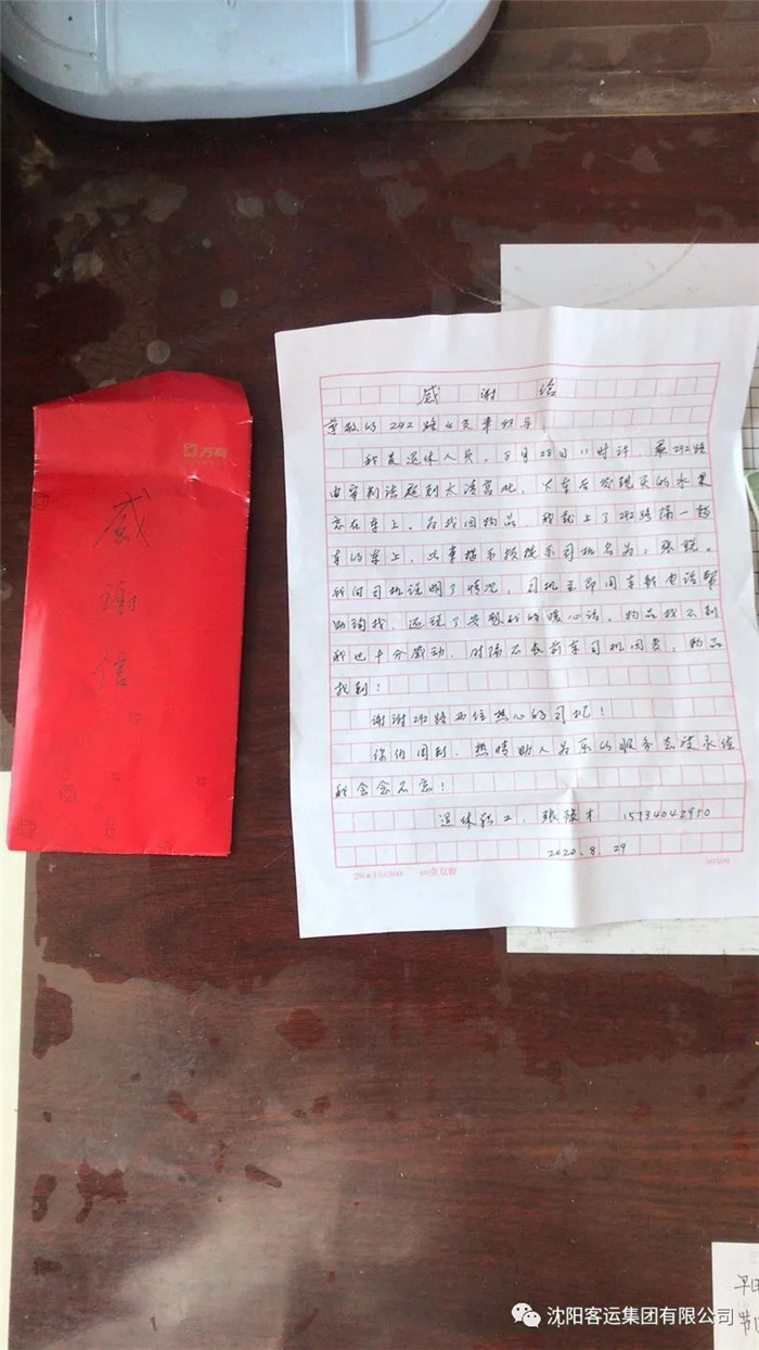 深受感動的老人第二天一大早就帶著一封感謝信來到了292車隊,對駕駛員張銳在工作中的熱情和責(zé)任心表示贊揚。