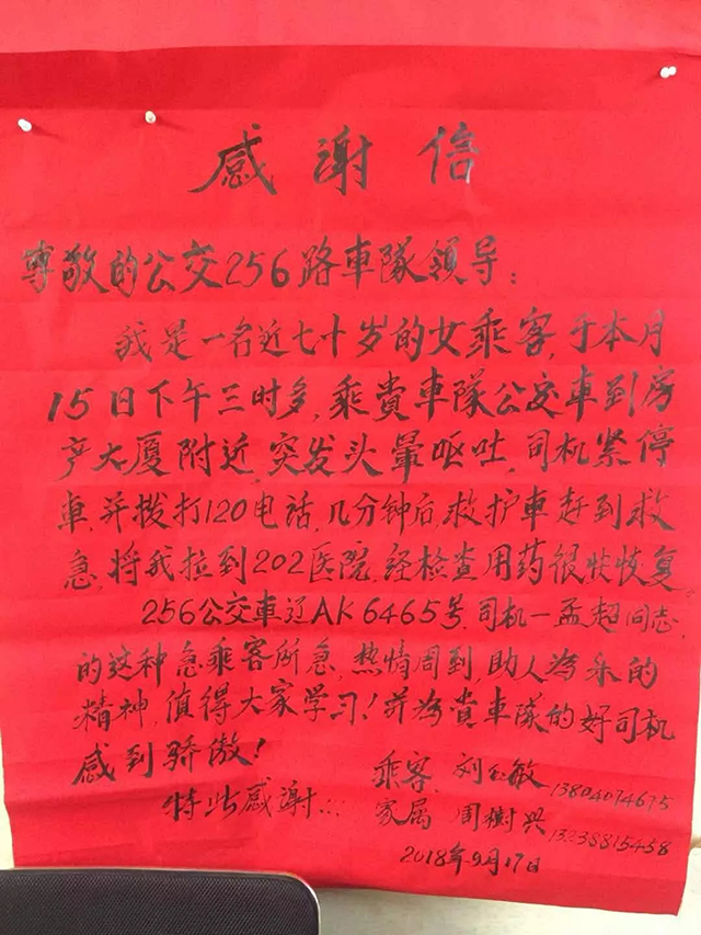 兩天后,老人攜同老伴,將一封寫滿真情的感謝信送到了通利公司256車隊(duì)。老人說:“當(dāng)天舊疾復(fù)發(fā),非常危急,萬幸救護(hù)及時(shí)才沒有釀成悲劇。”據(jù)悉,在經(jīng)過短暫治療后,老人不顧阻攔,堅(jiān)持要親自來到公交車隊(duì)對(duì)孟超同志表達(dá)感謝,并請(qǐng)求車隊(duì)領(lǐng)導(dǎo)對(duì)孟超這種救死扶傷的高尚品德提出鼓勵(lì)與表揚(yáng)。老人在站務(wù)室等待了近兩個(gè)小時(shí),才將這份真誠的謝意親自交到了駕駛員孟超的手上。